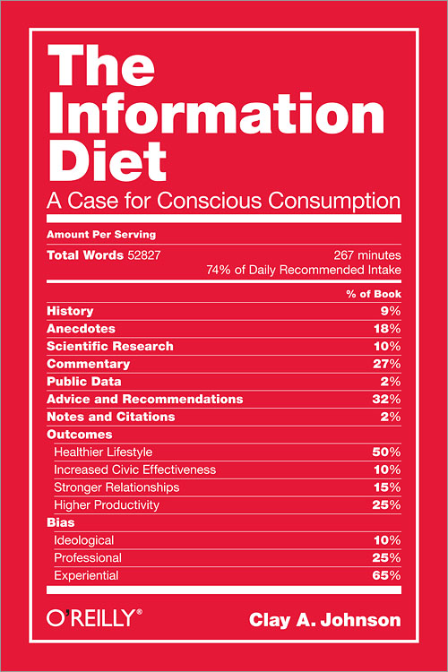 Based on the O’Reilly book by Clay A. Johnson, The Information Diet, A Case for Conscious Consumption I think it is time to get going on this topic. Buy the book, read the cover, read the sample chapter on O’Reilly, read the Lifehacker article on the topic, but get going.